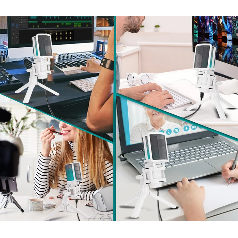 Este conjunto completo de microfone é a escolha ideal para quem procura som de qualidade para streaming, podcasting ou chamadas online. Graças ao suporte de mesa estável com braço, é possível fixar o microfone facilmente à mesa de trabalho e ajustá-lo flexivelmente conforme necessário. O pacote inclui também um filtro pop, que elimina eficazmente as manifestações sonoras indesejadas ao pronunciar consoantes sibilantes. A conexão através do cabo USB garante uma ligação rápida e simples, sem necessidade de instalação complicada. A moderna iluminação RGB confere um aspeto estiloso e cria uma atmosfera profissional em cada utilização.