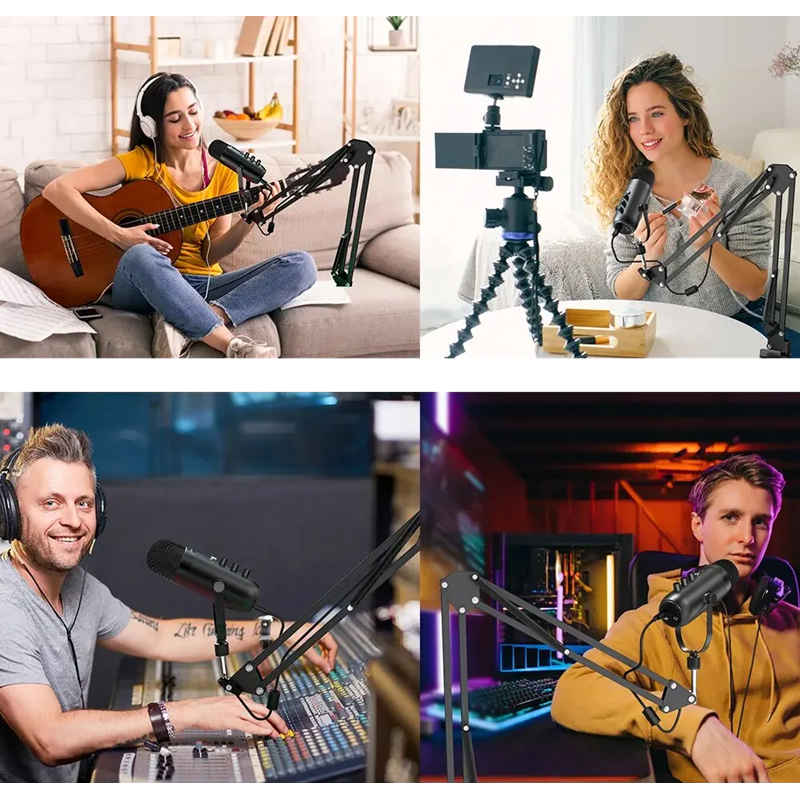 Microfone profissional para podcast com braço e base de mesa 3 articulações Plug and Play USB proteção de espuma contra vento