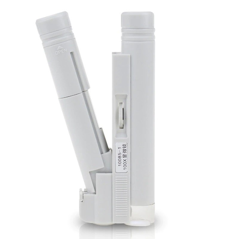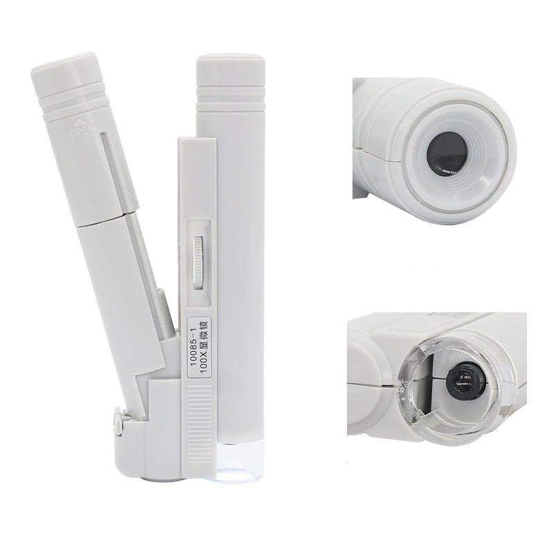 Aumento máximo de 100x. Portátil. Luz LED. Descrição completa
