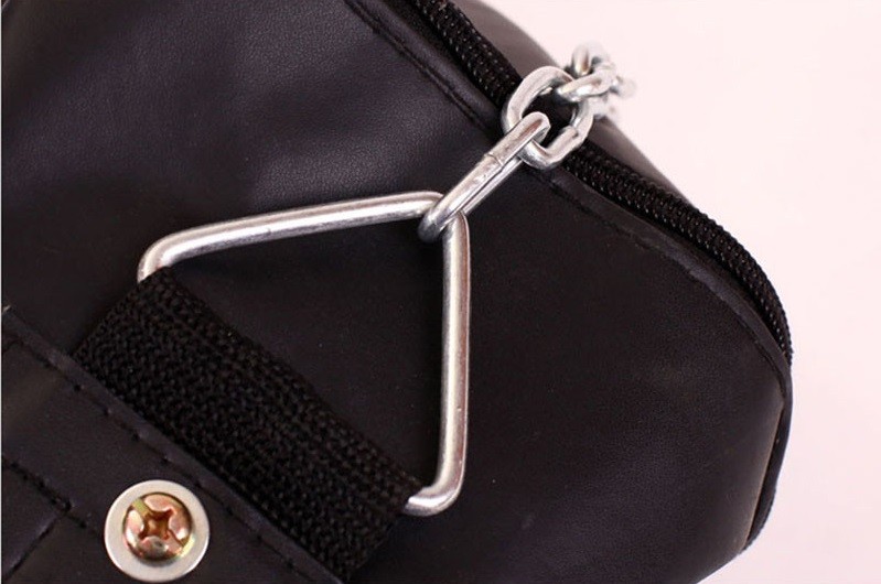 O saco é fixado com uma corrente, tendo em cima um fecho de correr para fácil enchimento.