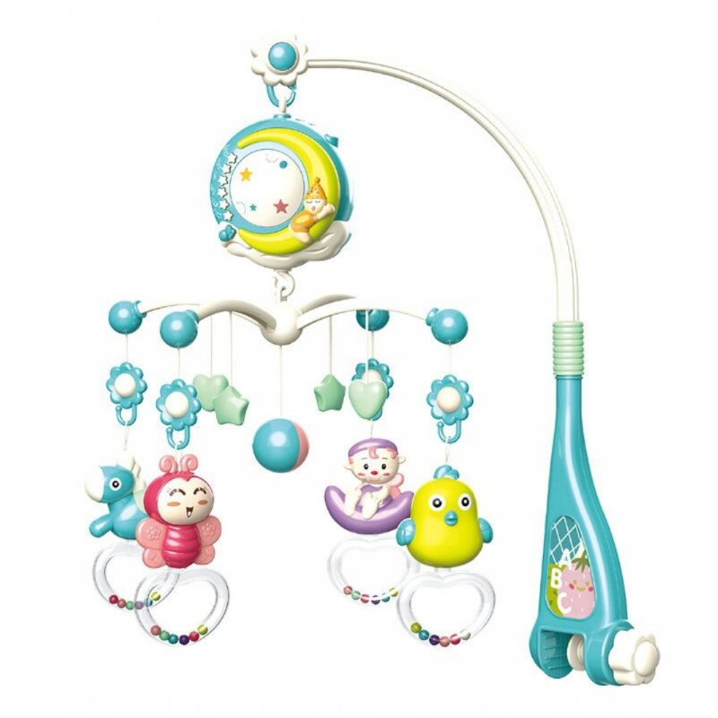 Características e equipamentos: ajuste de volume, melodias, canções, sons da natureza, temporizador, brinquedos suspensos removíveis, projetor, rotação 360°, controlo remoto