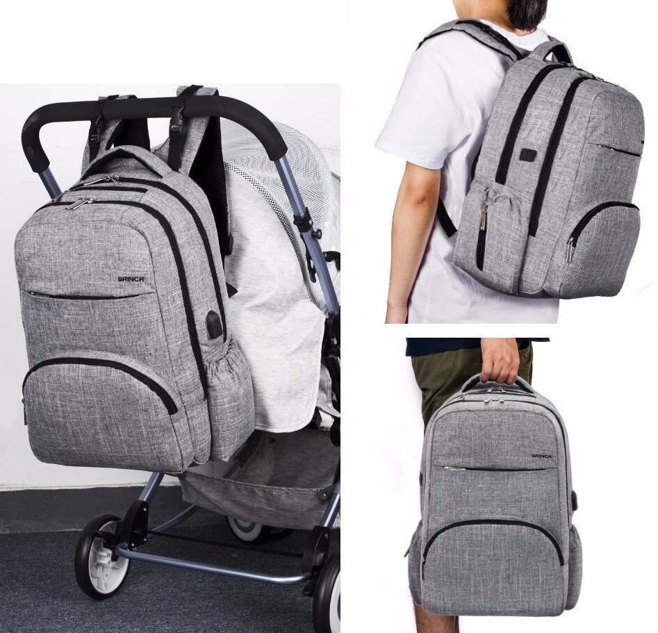 Mochila materna multifuncional impermeável com duas bolsas principais com fecho de correr.