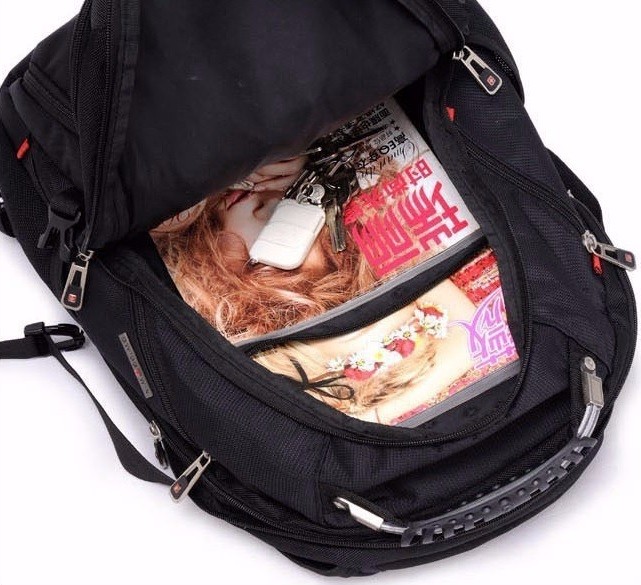 • bolsa inferior frontal também com fecho de correr duplo com vários compartimentos para telemóvel, caneta, carteira