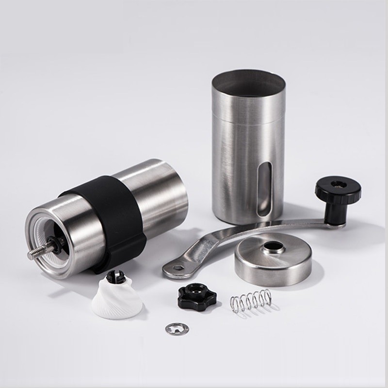 Moedor de café manual em aço inoxidável com lâmina de cerâmica.