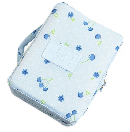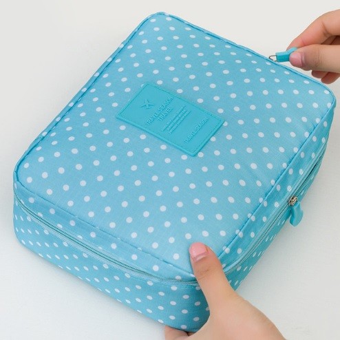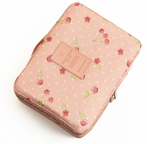 Necessaire feminina com pequenos poás ou cerejas para uma organização clara dos produtos de cosmética necessários para a viagem.