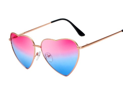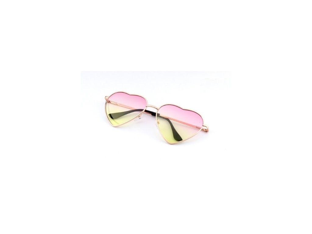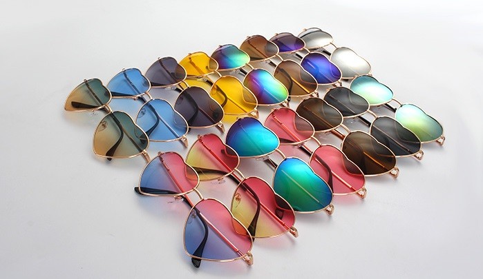 Óculos de sol estilosos em tons coloridos. As armações são original e artisticamente moldadas em forma de coração.