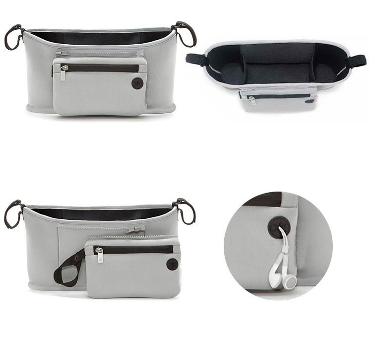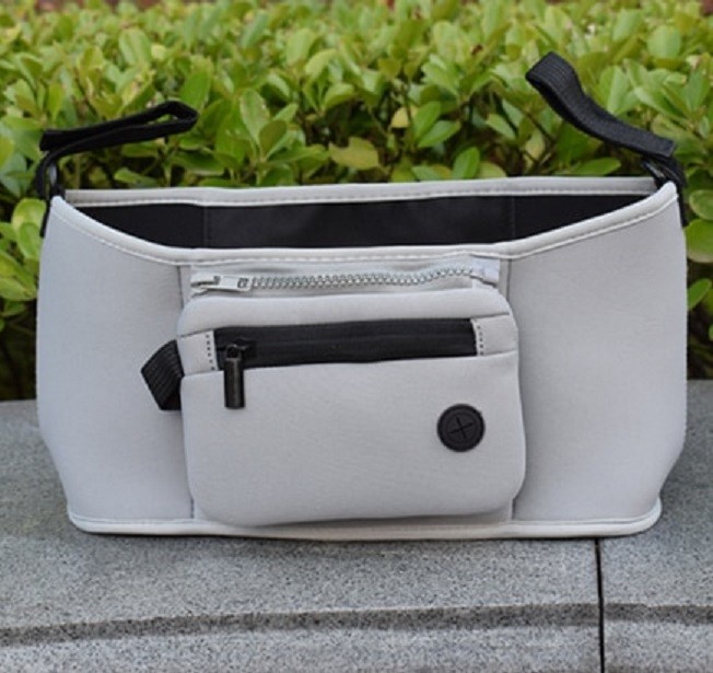 Organizador funcional para artigos de bebé com alças para prender ao punho do carrinho.