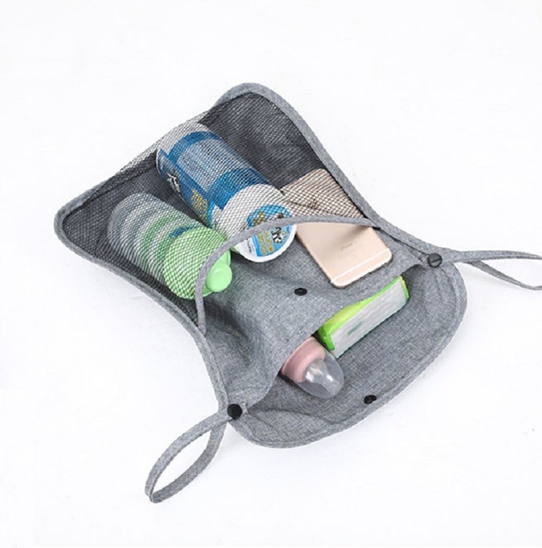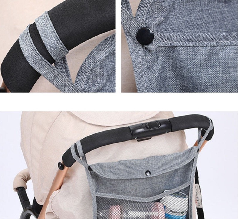Prático organizador suspenso de artigos para bebés no carrinho.
