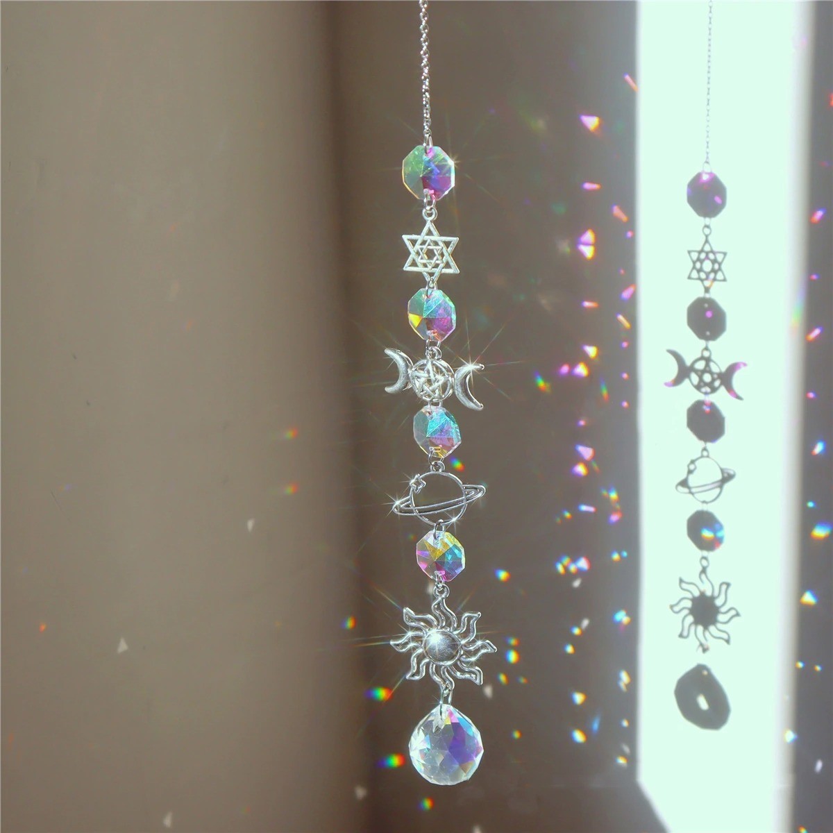 Na composição suspensa estão um planeta, uma estrela, o sol e belos ornamentos. Este magnífico ornamento suspenso é feito de cristal artificial e aço inoxidável. Foi projetado para refletir a luz e adicionar um brilho a qualquer ambiente. O design é elegante e cativante, tornando-o o complemento perfeito para qualquer interior de casa.