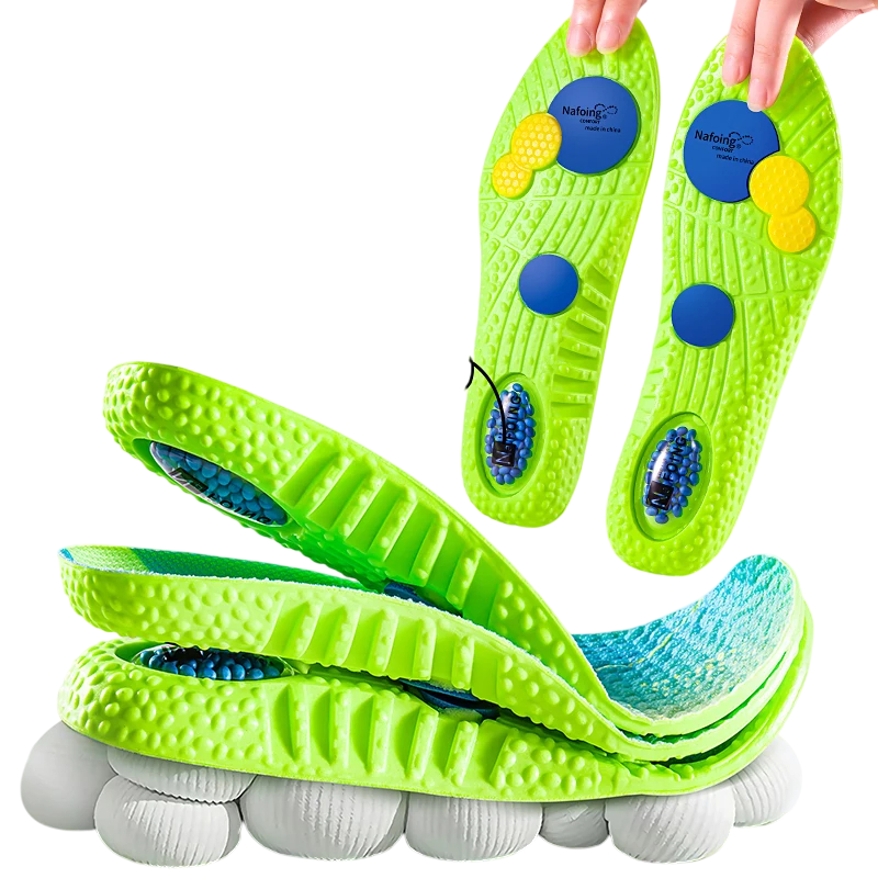 Palmilhas de gel confortáveis com design verde para uso diário, com amortecimento de impactos, apoio para os pés e absorção de suor. Descrição completa