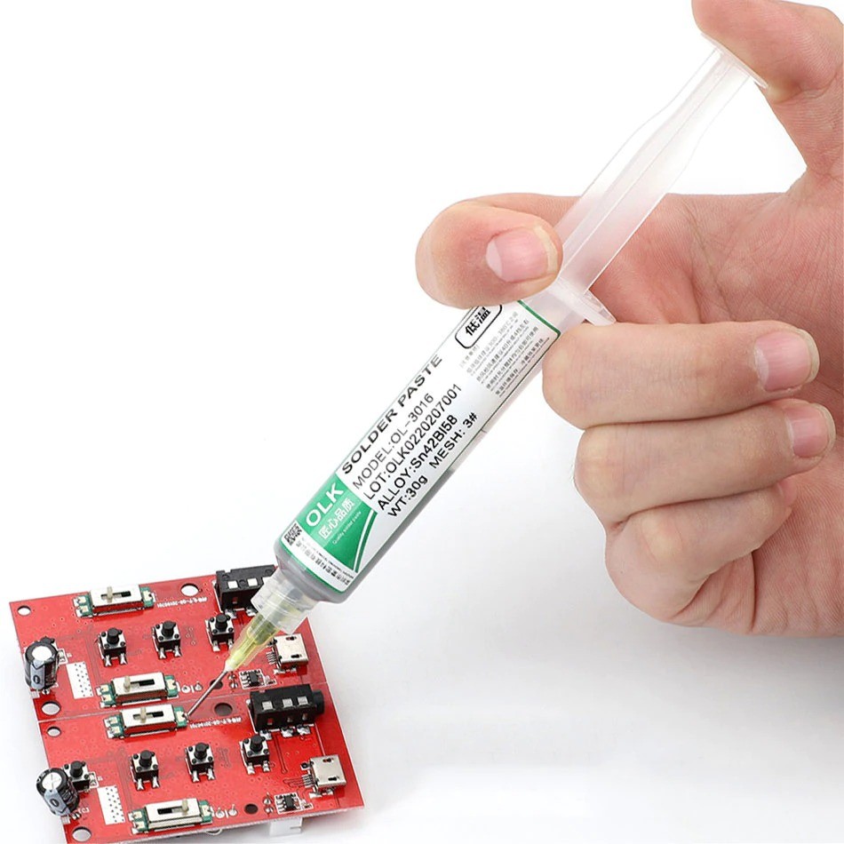 Pasta de soldadura sem chumbo a baixa temperatura. Adequada para placas LED especiais, resistentes a altas temperaturas. No conteúdo da embalagem estão duas pontas com agulha para uma aplicação mais precisa da pasta.