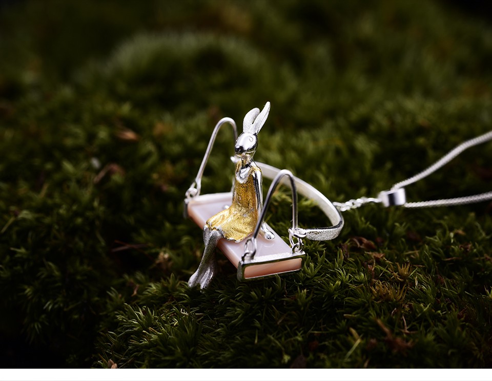 Temos para si um pendente prateado, feito à mão, único, representando uma coelha a baloiçar.