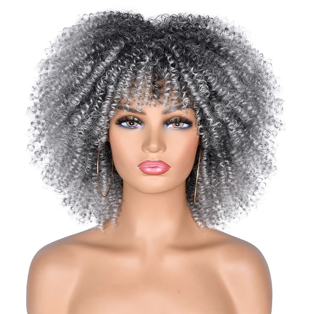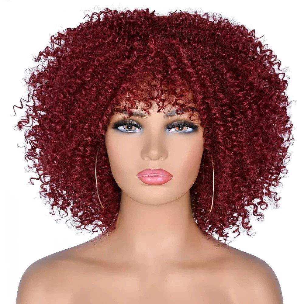 Peruca encaracolada feminina com franja. Resistente a danos. Confortável de usar. Pode ser lavada com champô e estilizada. Fabricada a partir de fibra sintética de alta qualidade.