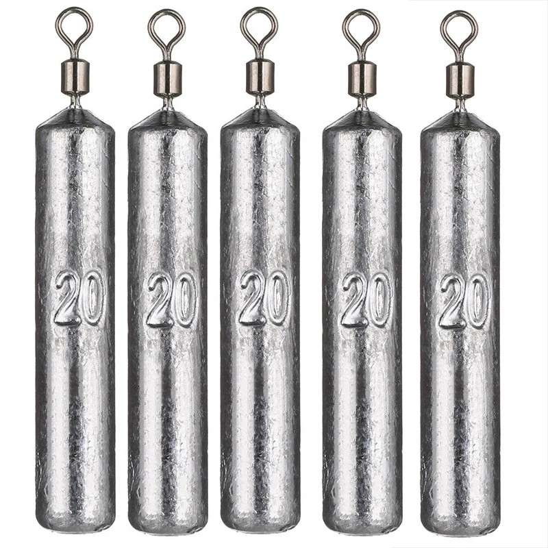 Conjunto de 5 pcs de chumbadas cilíndricas em chumbo com girador para mergulho estável e lançamento a longa distância. Adequado para a pesca de carpas e siluros. Descrição completa