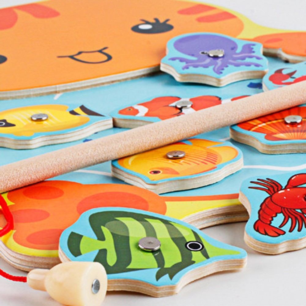 Brinquedo divertido que combina um puzzle de agarrar e a pesca. O jogo é feito de madeira.