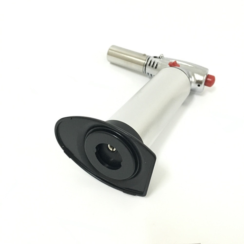 Tem tamanho de chama ajustável. Enche-se com gás clássico de isqueiro.