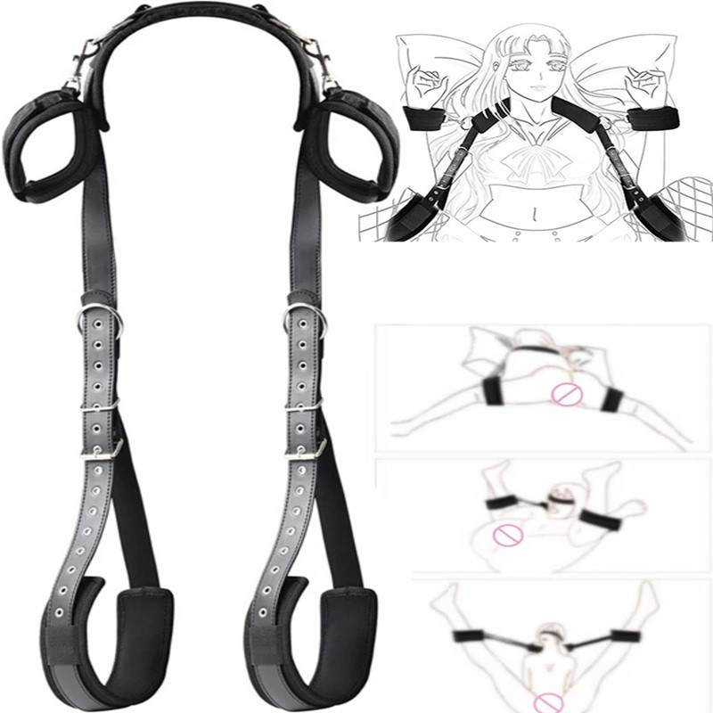 Posteiro de couro com argolas para as pernas e algemas para as mãos em uma peça, acolchoamento suave, fecho ajustável, embalagem discreta