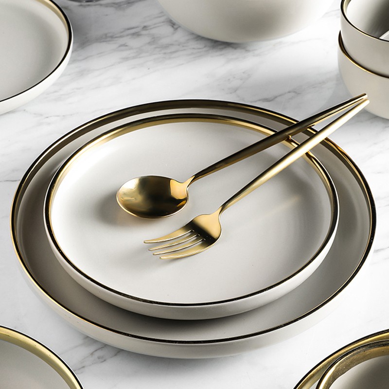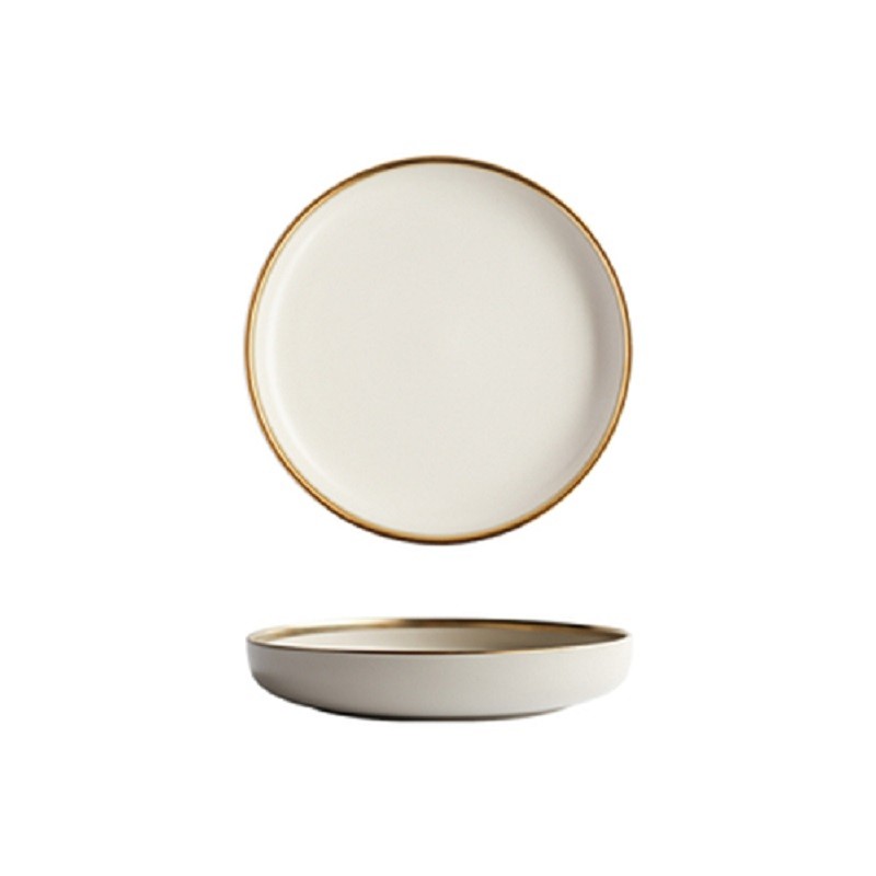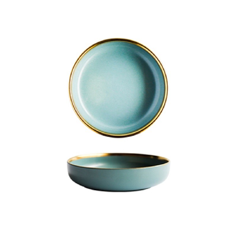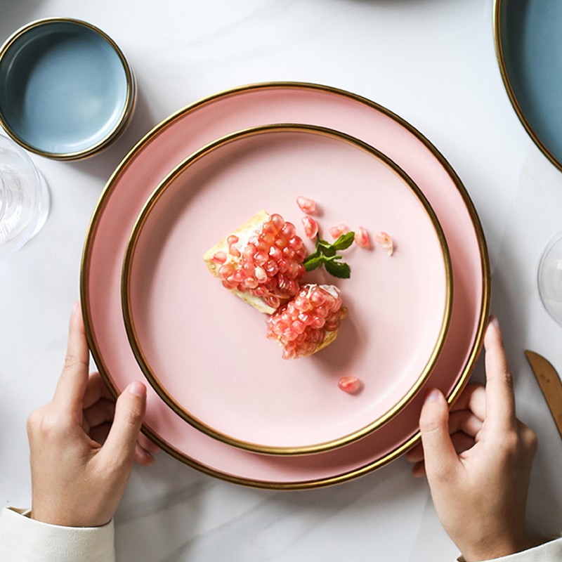 Prato em cores pastel com uma linha dourada.