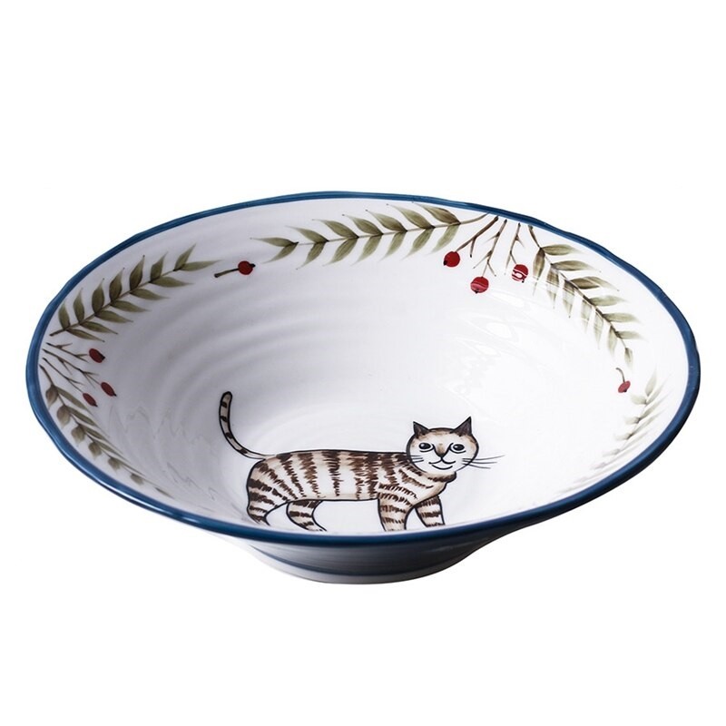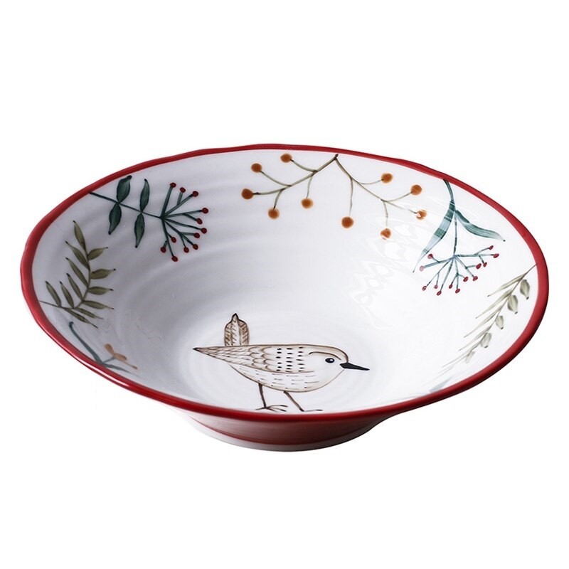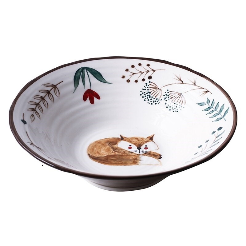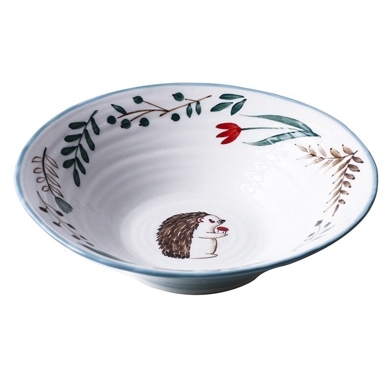Prato fundo com uma pintura decorativa de animais e flores.