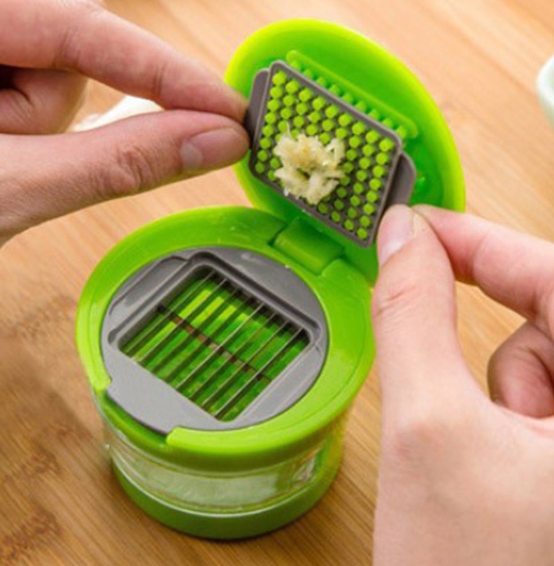Coloque o alho descascado na superfície de aço inoxidável e, ao pressionar, o alho será esmagado para dentro do recipiente.