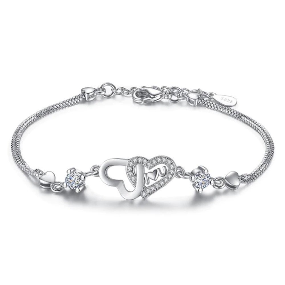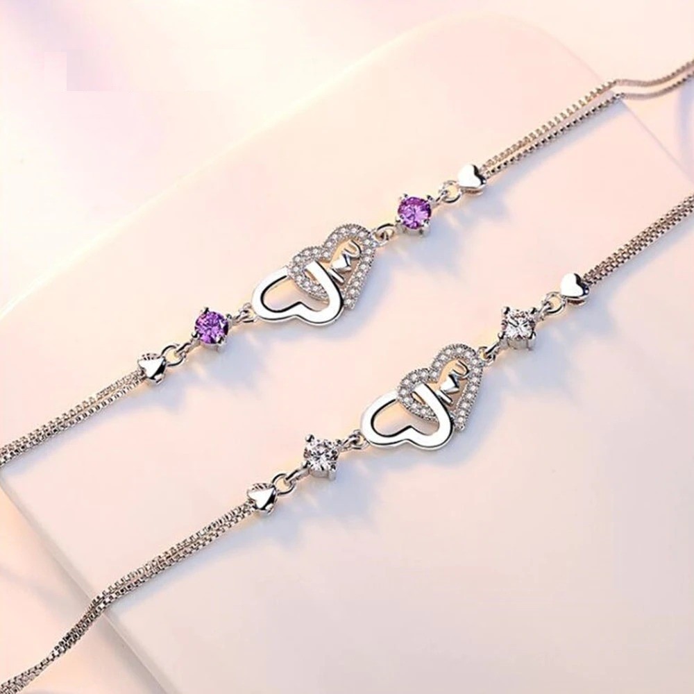 Pulseira feminina corações entrelaçados e pedras
