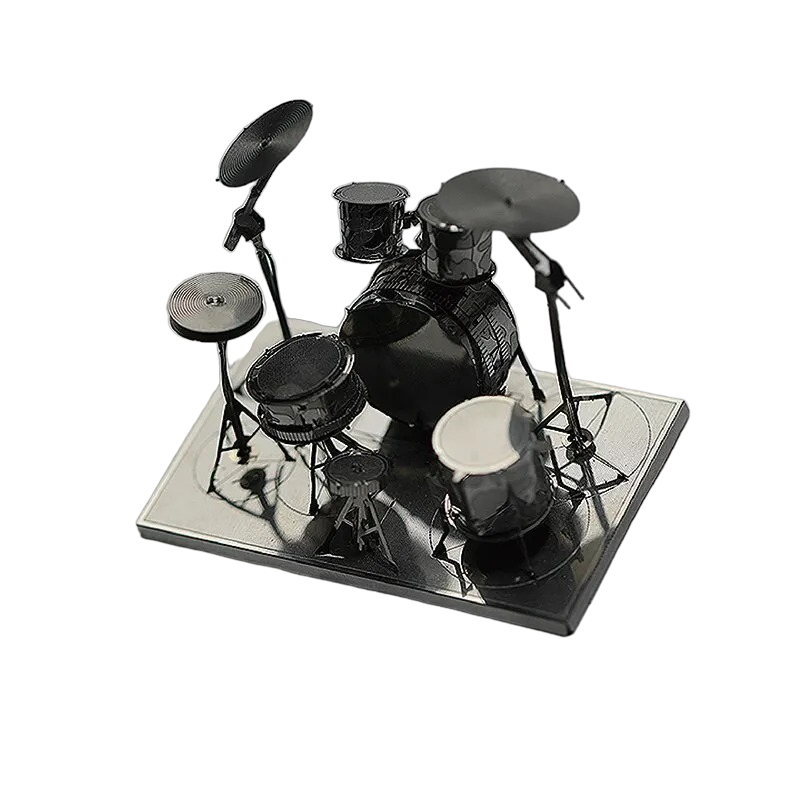 • Design realista: A principal vantagem deste produto é a utilização de peças metálicas, que são precisamente fabricadas e moldadas na forma de um instrumento de percussão. Cada detalhe é cuidadosamente trabalhado, resultando numa magnífica réplica de uma bateria.