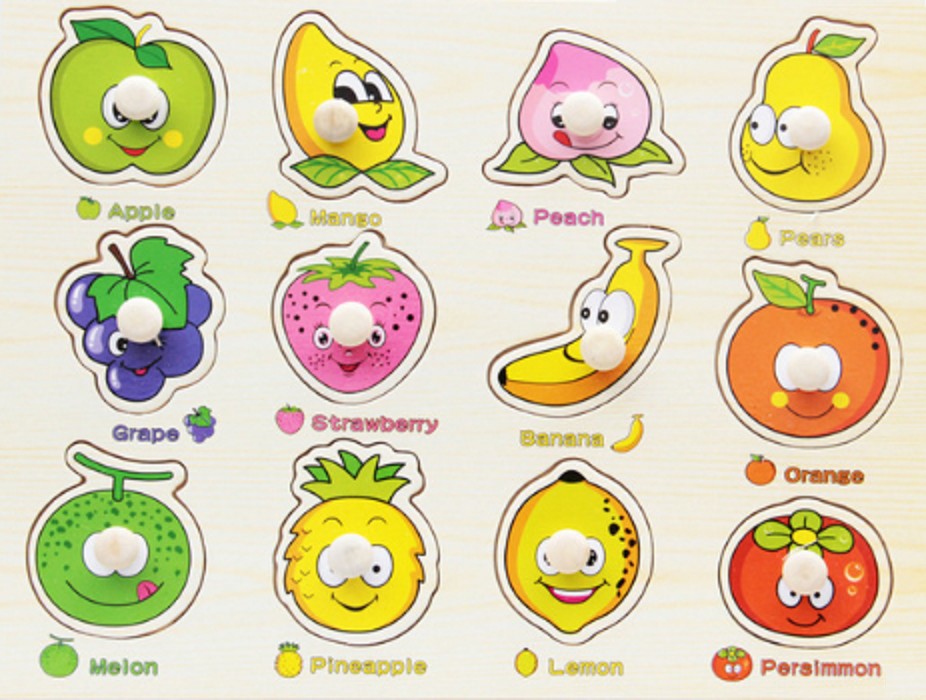Puzzle de madeira colorido para crianças com motivos de animais, meios de transporte, membros da família, frutas, etc.