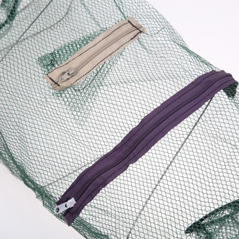A rede tem forma retangular e de cada lado há uma abertura onde se coloca a isca.