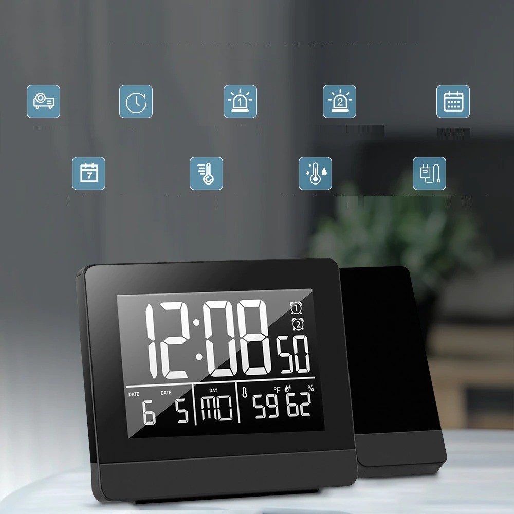 Funções: projeção de hora, despertador duplo, termómetro, calendário, higrómetro
