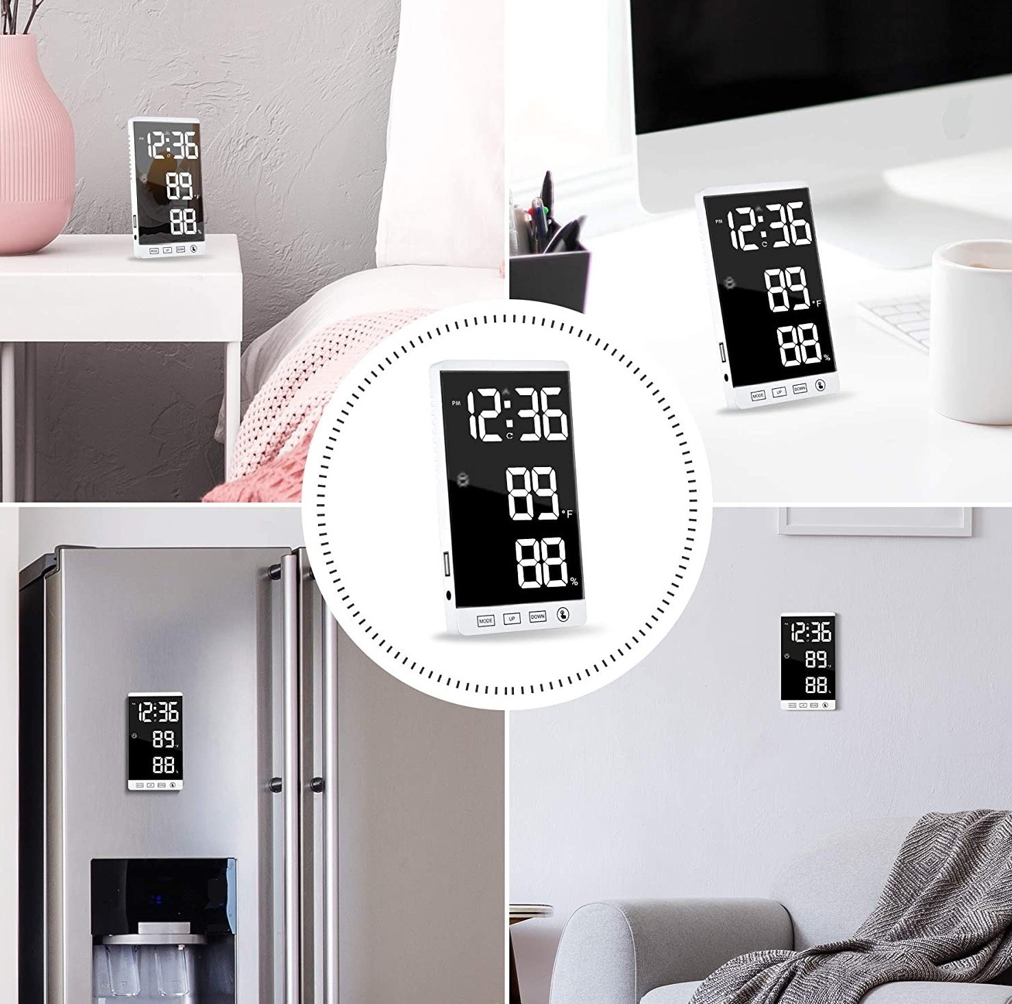 Funções: porta USB, termómetro, higrómetro, ajuste de brilho, despertador, iluminação nocturna