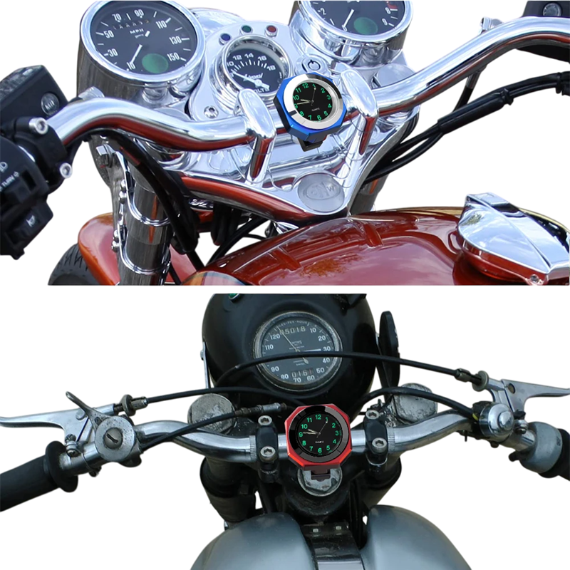 Relógios de alumínio resistentes para moto com impermeabilidade IPX7, para guiadores de 22–28 mm, com mostrador luminoso visível mesmo à noite, fácil de montar. Descrição completa
