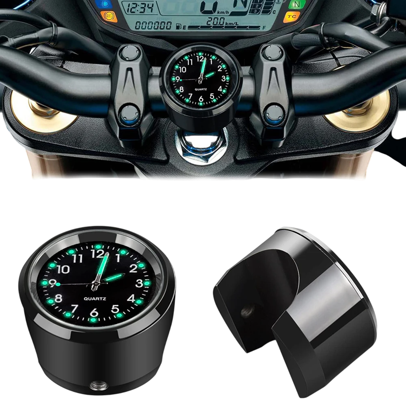 Elegantes relógios cromados para motocicleta com construção em alumínio à prova d'água, mecanismo quartz e mostrador luminoso para visão noturna. Descrição completa