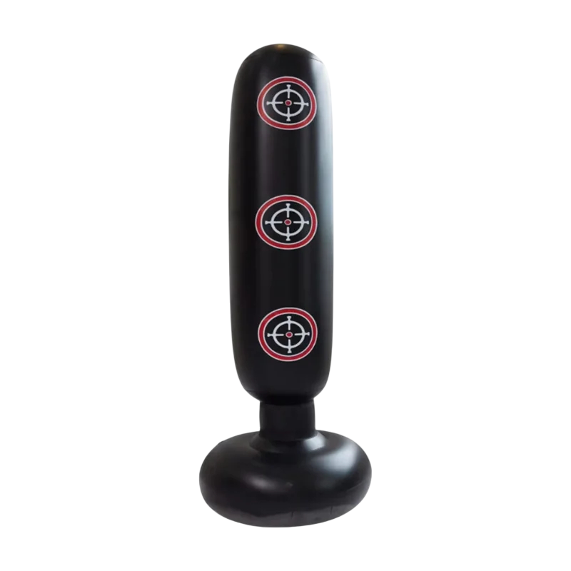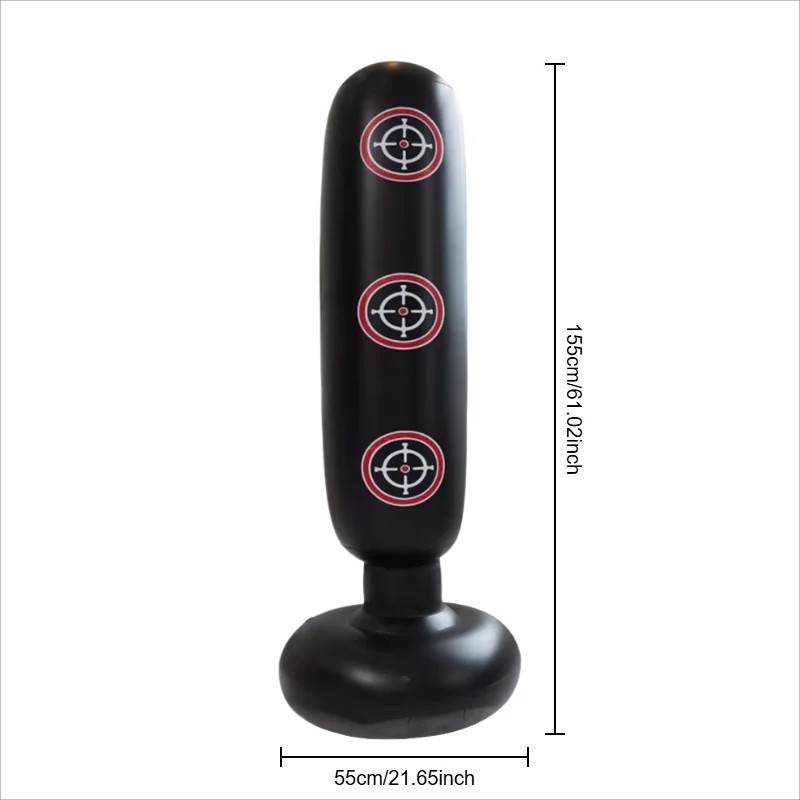 Este saco de boxe insuflável é o parceiro de treino ideal para crianças e adultos. Graças às suas dimensões 155x55 cm, é adequado tanto para jogos infantis como para o treino de atletas adultos. O saco infla facilmente e a sua estabilidade é garantida por uma base preenchida com areia ou água, o que o mantém firme mesmo durante golpes intensos. É fabricado em material resistente e flexível, que suporta o uso prolongado. Este saco autónomo é uma excelente escolha para treino de boxe, karaté, MMA ou como equipamento de fitness para melhorar a condição física e a coordenação. É também uma forma perfeita de libertar stress enquanto se diverte.
