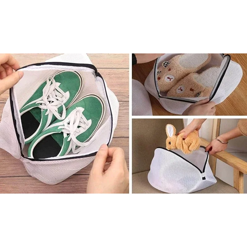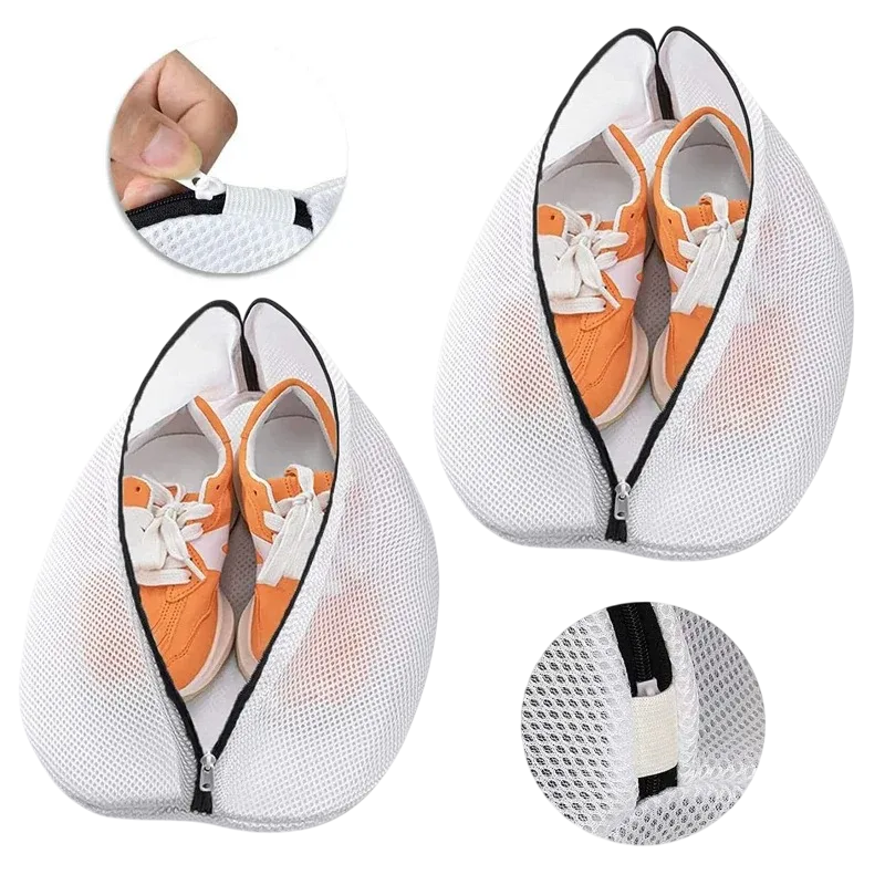 Saco de rede leve protege o calçado durante a lavagem na máquina, evitando danos à máquina e aos sapatos, garantindo uma limpeza eficaz e delicada. Descrição completa