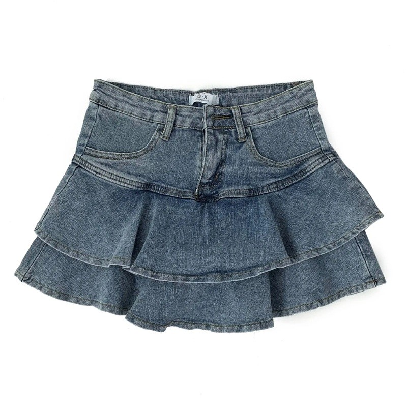 Saia de ganga curta em denim azul com cintura alta Saia mini em camadas com corte em A Saia casual feminina à cintura Conjunto de verão estiloso Descrição completa