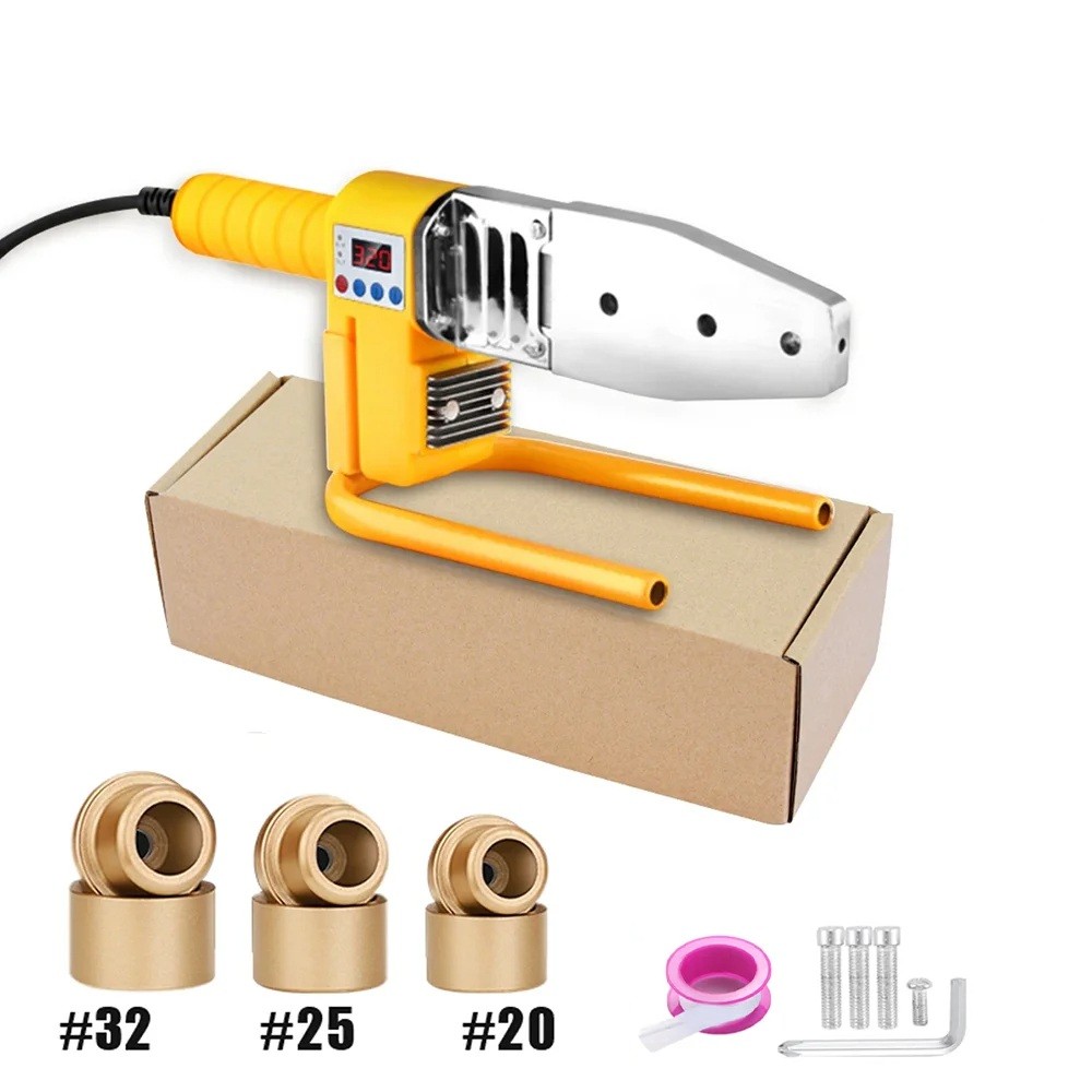 Saldadora de ar quente 800W para tubos plásticos com visor digital, três acessórios e conjunto de acessórios. Alimentação 220 V. Descrição completa