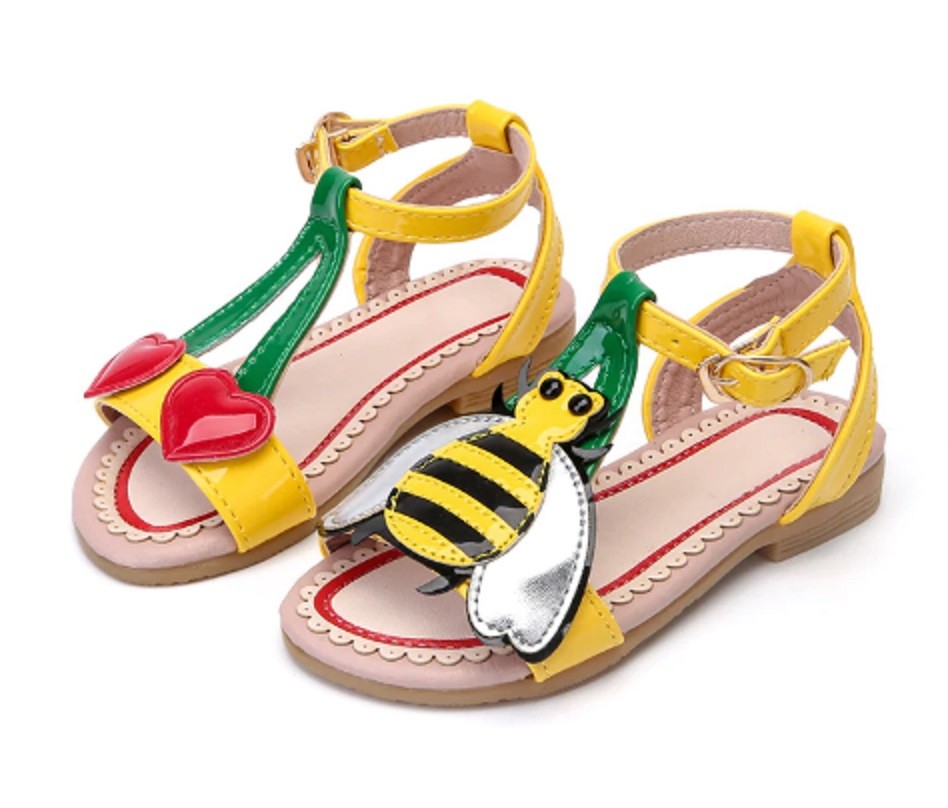 As sandálias são decoradas com uma abelha e cerejas em forma de coração.