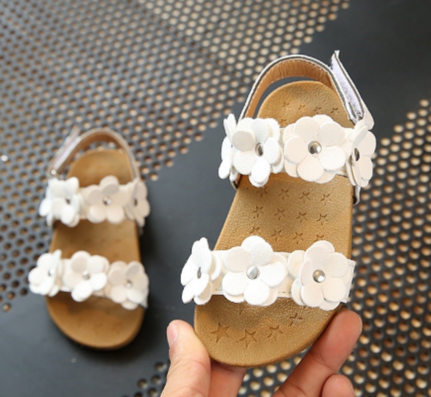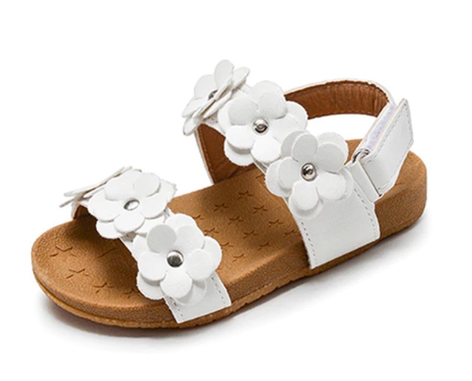 As sandálias são decoradas com flores e têm uma tira no calcanhar, o que proporciona um ótimo ajuste ao pé.