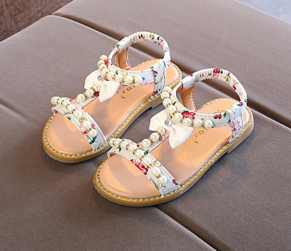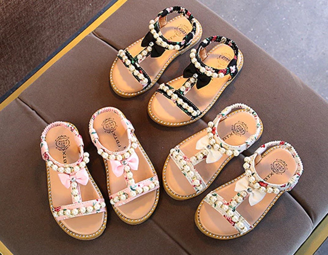 Sandálias de menina decoradas com pérolas serão um excelente complemento para um vestido ou saia.