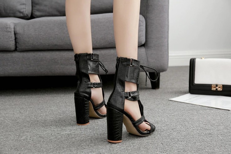 As sandálias possuem um salto alto e fecham com um zip, que está na parte de trás.