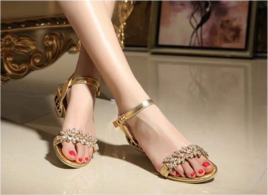Estes sandálias douradas com pedras vão certamente conquistar o seu coração.