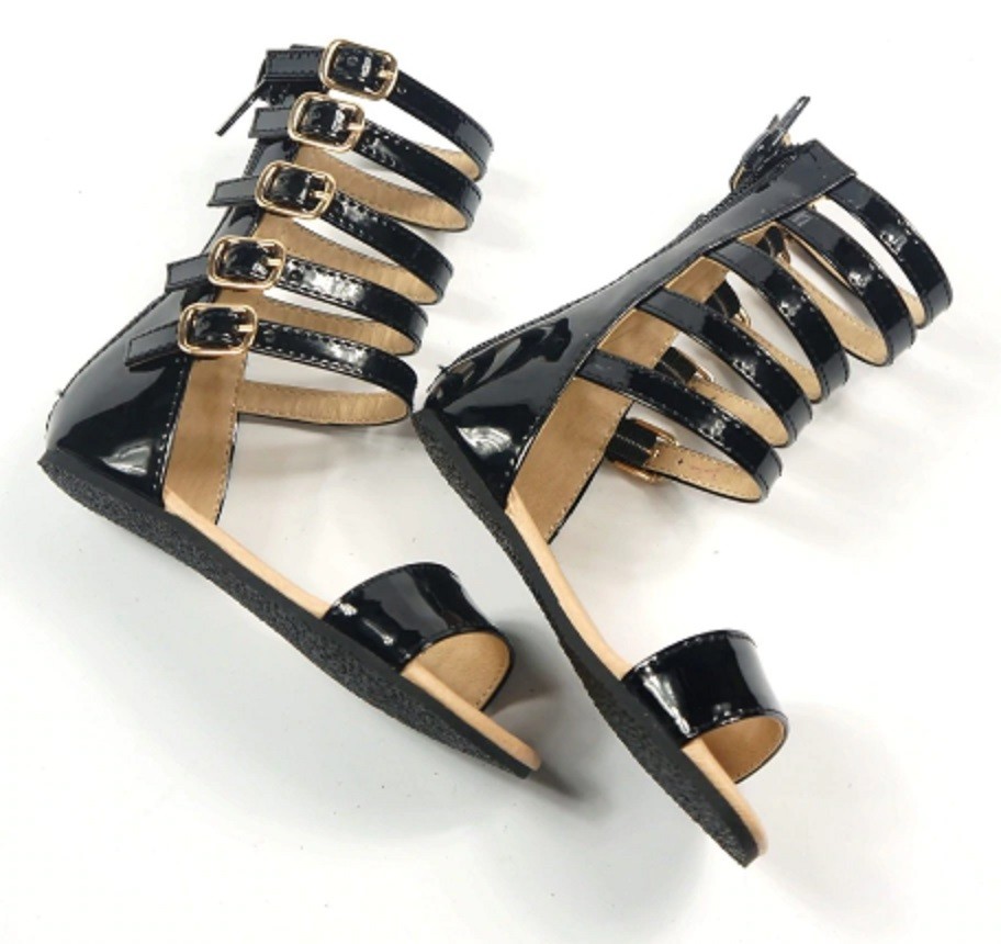 As sandálias têm tiras que se fecham na parte de trás com um zíper.