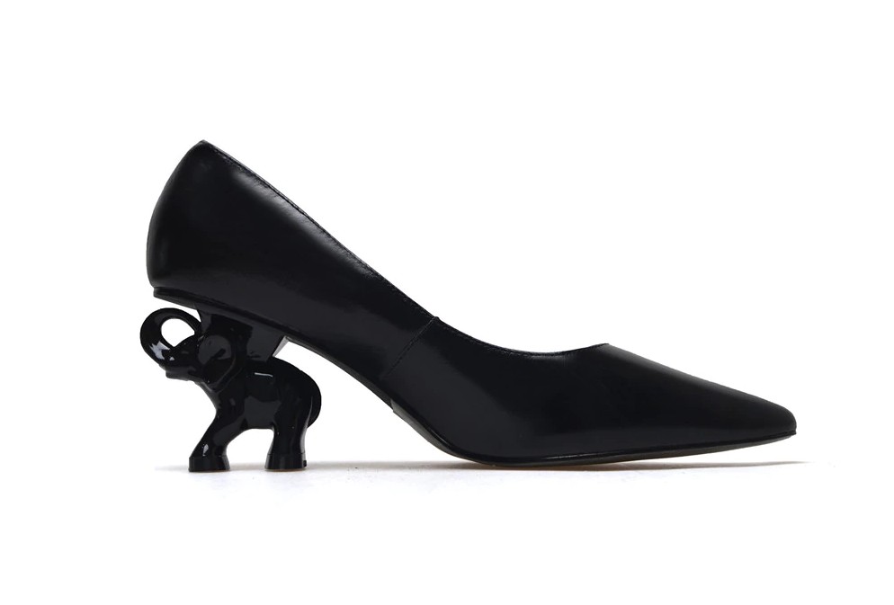 Estas sapatilhas têm um salto em forma de elefante, que segura a sapatilha com a sua tromba.