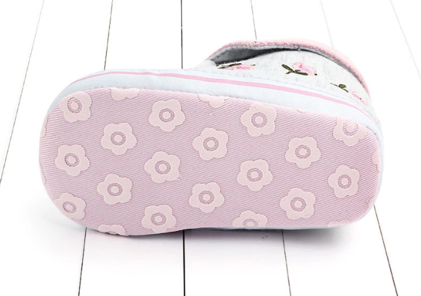 Os sapatinhos têm uma sola antiderrapante, que evita que os pezinhos escorreguem durante o treino dos primeiros passos.