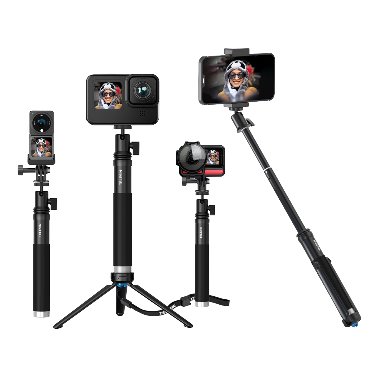 Compatibilidade: GoPro, Insta360, DJI Osmo Action, DJI Action 2, SJCAM, EKEN, telemóvel com diagonal de 4 - 6"​​​​​​, câmara compacta com rosca de 1/4''