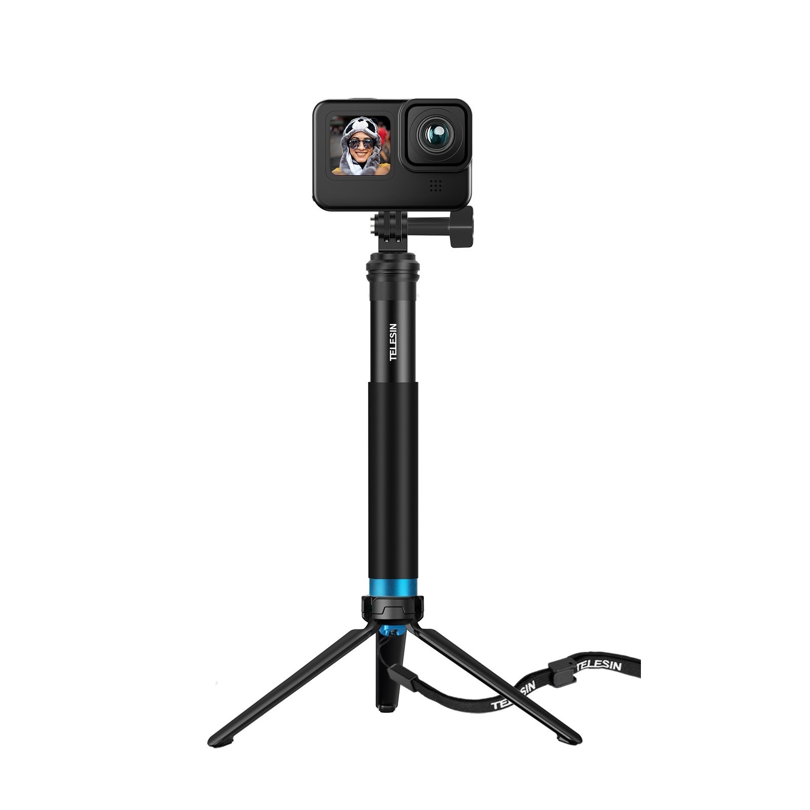 Compatível com GoPro, Insta360, DJI Osmo Action, DJI Action 2, SJCAM, EKEN, com câmaras com rosca de 1/4''. Peso: 185 g. Comprimento: 22,4 - 91 cm. Monopé. Rotação 360°. Pode ser utilizado debaixo de água. Descrição completa