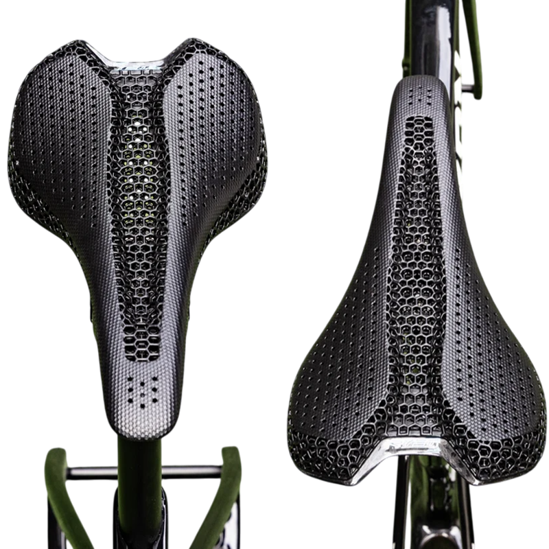 Selim inovador em carbono impresso em 3D, com baixo peso e alto conforto, adequado para triatlo, MTB, gravel e ciclismo de estrada. Descrição completa