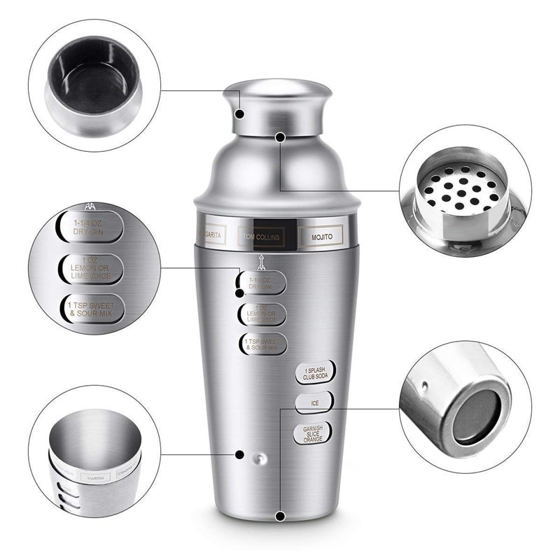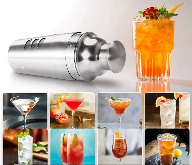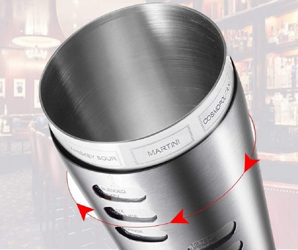 O shaker tem uma parte superior rotativa para escolher a bebida desejada e, abaixo, são apresentadas as ingredientes necessárias e o estilo de preparação.