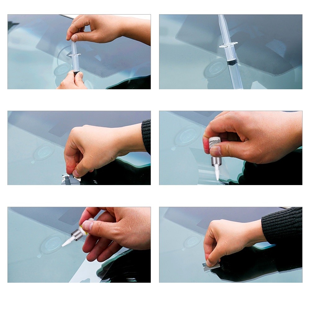 • variante 2: 1x injetor para reparação de vidro para-brisas, 1x resina de reparação, 3x selos adesivos, 1x base, 5x filme de reparação, 1x lâmina, 1x pano, 1x lanterna, 1x manual