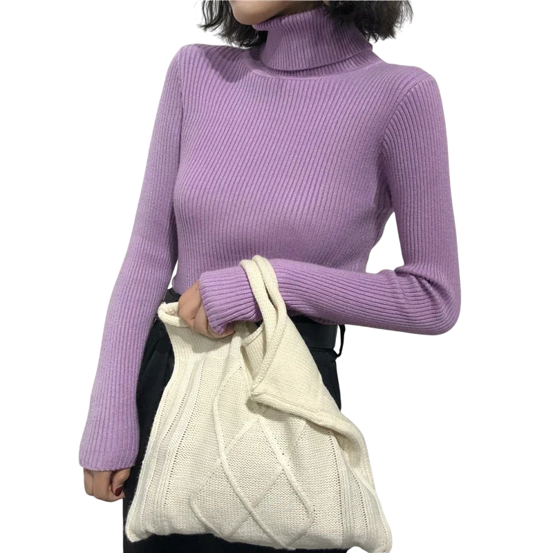 Suéter feminino com gola alta em algodão e acrílico Suéter de malha elegante de uma só cor com mangas longas Tamanho universal para outono e inverno